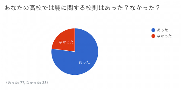 「あなたの高校では髪に関する校則はあった?なかった?」の質問では、あったが77%、なかったが23%という結果となりました。