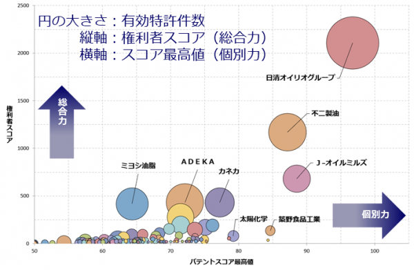 植物性食用油脂は食品製造や調理用の油として用いられるだけでなく、サプリメントや薬用カプセルの成分に用いられるなど幅広い分野で活用され、今調査では用途全般を対象としました。また今調査では、日本の特許庁で公開されている植物性食用油脂関連技術全般について、個別特許の注目度を得点化する「パテントスコア」をベースに、特許の質と量から総合的に見た評価を行いました。