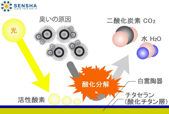 塗布直後から塗布面に付着したウィルスや雑菌を除去。有害物質を無害な水と二酸化炭素に変化させます。
