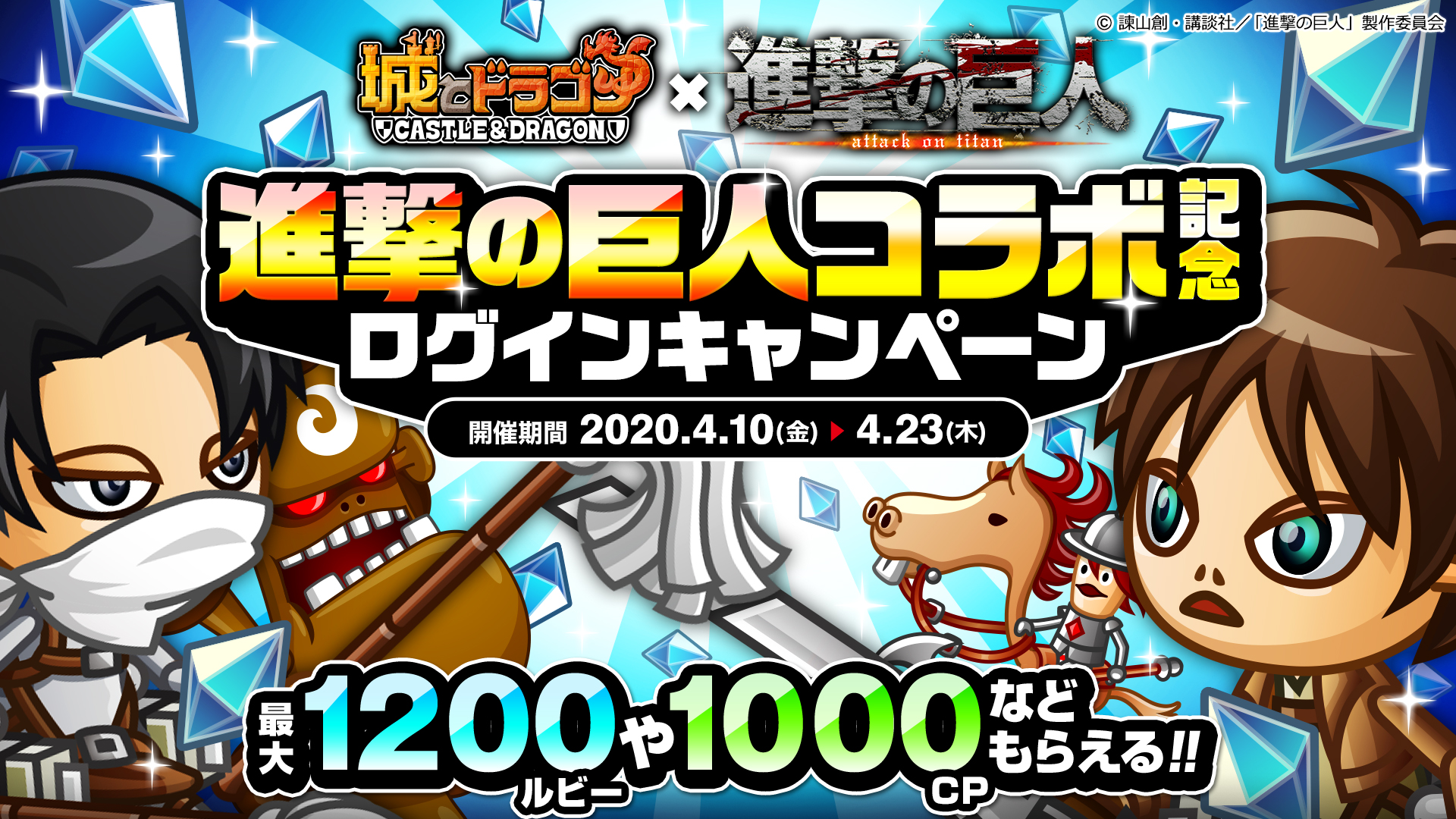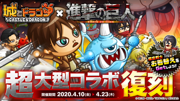 株式会社アソビズム(本社:東京都千代田区、代表取締役:大手智之)は、App Store・Google Playにて好評配信中の『城とドラゴン』で、2020年4月10日(金)よりテレビアニメ『進撃の巨人』とのコラボイベントを開催いたします。