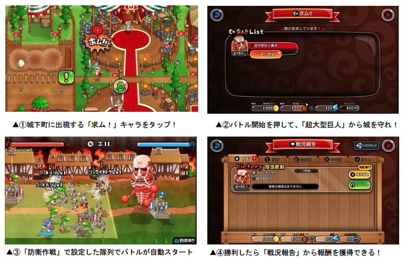 『城とドラゴン』に突如現れた「超大型巨人」の駆逐を目指すコラボ襲来イベント「超大型巨人襲来」を開催いたします。コラボ期間中、1日1回、プレイヤーの城に突如「超大型巨人」が攻めてきます。「超大型巨人」が出現した際は、城下町に「求ム!」キャラが登場し、プレイヤーにお知らせしてくれます。襲来イベントは「防衛作戦」を使用して「超大型巨人」を自動で迎え撃ち、勝利すれば報酬が獲得できますので、襲来に備えて防衛隊列を整えましょう!また、襲来イベント時は「進撃の巨人」マップとなり、コラボ限定キャラ「調査兵団」の攻撃力が上昇します。