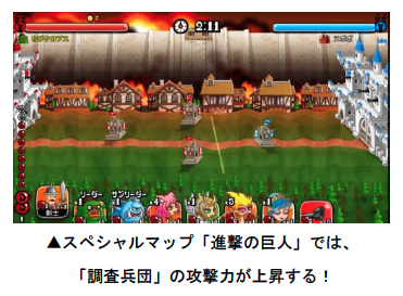 期間中、フリー対戦のバトルマップが「進撃の巨人マップ」に変化します。「進撃の巨人マップ」では、「調査兵団」の攻撃力が上昇します。「調査兵団」を使いこなして、バトルに勝利しよう!