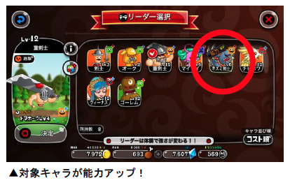 リーグで行われるすべてのバトルを対象に、特定のキャラをリーダーにすると能力値(攻撃・防御・HP)やスキル発動率がアップします。