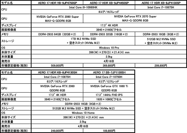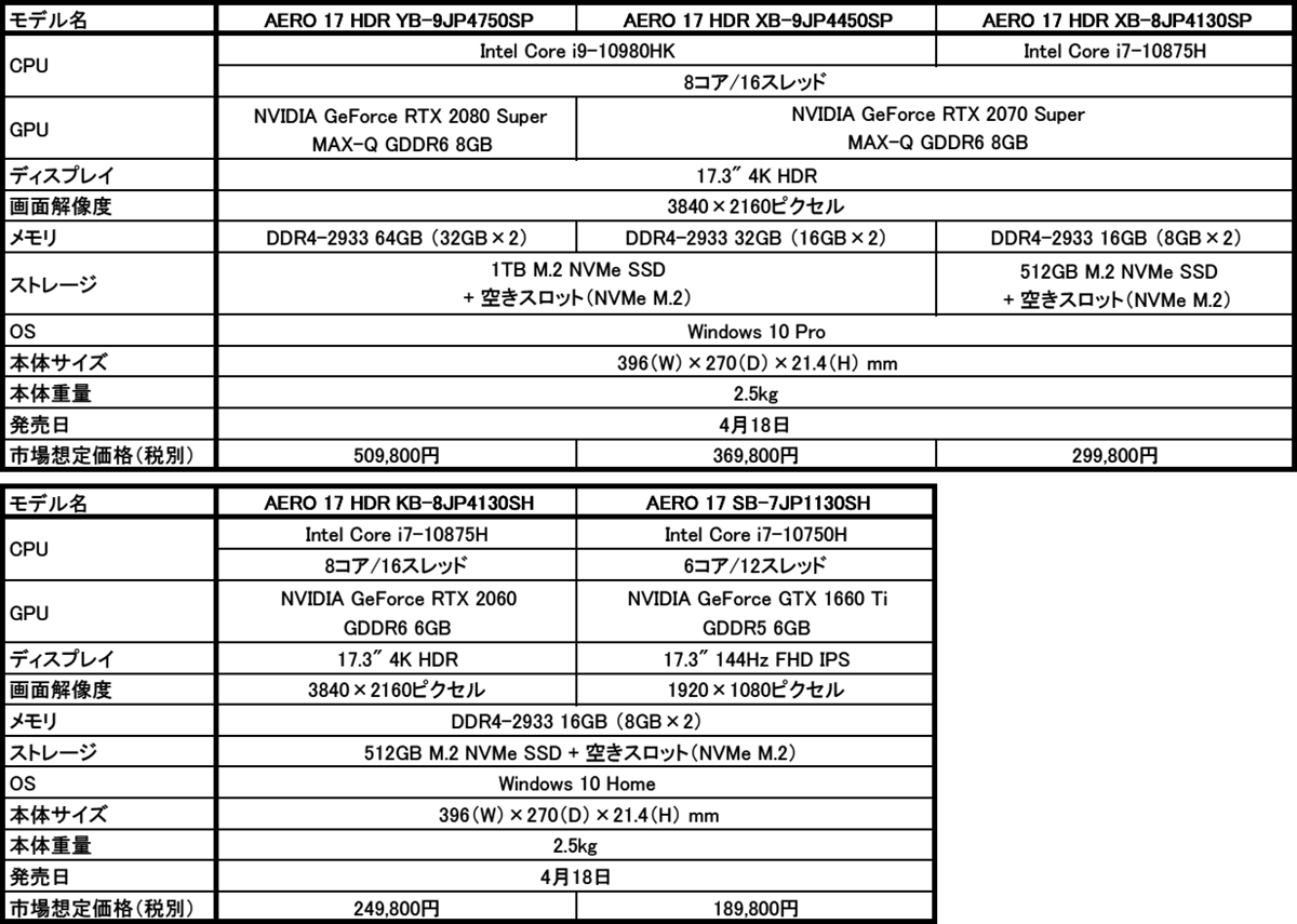 一方、Adobe RGB 100%をカバーする17.3型4K HDRパネルを採用したAERO 17 HDRシリーズでは、CPUに8コア/16スレッドのIntel Core i9-10980HKを搭載し、NVIDIA GeForce RTX 2080 Super with Max-Q 8GBを組み合わせるとともに、メモリにDDR4-2933 64GB、ストレージに1TBのM.2 PCI-e SSDを備えた新しいフラグシップモデルとなる「AERO 17 HDR YB-9JP4750SP」など4モデルを追加するほか、17.3型フルHD 144Hzパネル搭載の下位モデルも用意いたします。