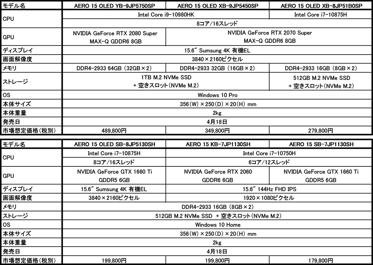 2020年4月13日 - GIGABYTE Technology Co., Ltd. 台湾・新北市 - コンピュータテクノロジーで世界をリードするGIGABYTE Technologyは、CPUに最大8コア/16スレッドの第10世代Intel Coreプロセッサを搭載するとともに、上位モデルにはNVIDIAのGeForce RTX Superシリーズを採用するなどの強化を図ったクリエイター向けノートPC「AERO 15 OLED」や「AERO 17 HDR」などの新モデル11製品を、Amazon.co.jp、Joshin webショップ、NTTぷらら、PCワンズ、TSUKUMO、アプライド、パソコンSHOPアークを通じて4月18日に発売いたします。また、先行予約販売を4月13日より開始いたします。