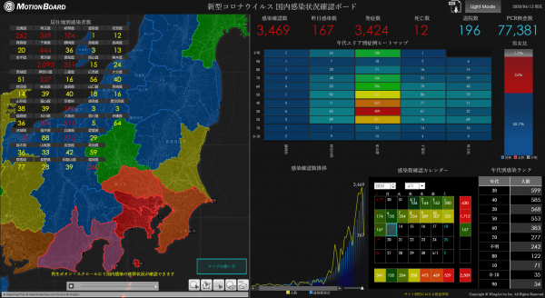ウイングアーク1stは、情報活用ダッシュボード「MotionBoard」を使用し、当社内にて本「新型コロナウイルス国内感染状況」を参照しておりました。この度、新型コロナウイルスの国内感染の状況を鑑み、当社内で活用していました本内容を幅広く開放することを決定しました。