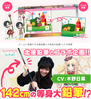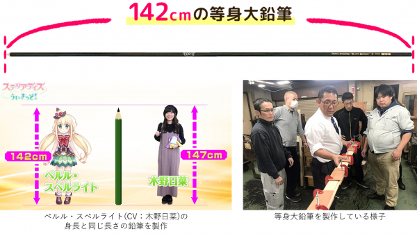 本ゲームのヒロインの1人である鉛筆キャラクター(CV:木野日菜)の身長142cmと同じ長さの等身大鉛筆を、北星鉛筆株式会社とのコラボレーションとして実製作いたしました。 長さ:142cm 直径:1.7cm 重さ:104グラム 濃さ:2B となっております。
