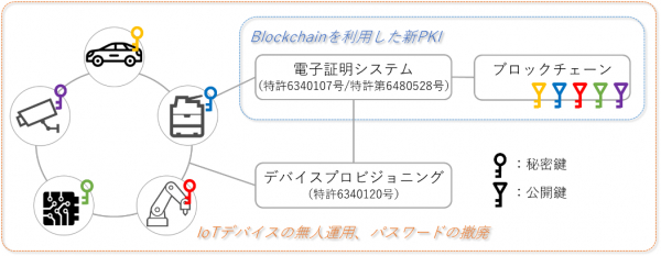 kusabiTM は、あらゆる「モノ = IoT(モノのインターネット:Internet of Things)」の安全な相互通信を目指した新 PKI 技術を提供し、IoT のシステムモデルに最適なセキュリティを実現します。kusabiTM が提供する新 PKI 技術は、ブロックチェーンが持つ論理的特性をシステムとして提供することで、機密性(Confidentiality)、完全性(Integrity)、可用性(Availability)に適応しています。さらに、新 PKI 技術をデバイスプロビジョニング技術に利用することで、ソフトウェアだけで高度な IoT セキュリティを実現いたします。
