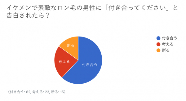 「イケメンで素敵なロン毛の男性に“付き合ってください”と告白されたら?」の質問では、付き合うが62%、考えるが23%、断るが15%という結果となりました。