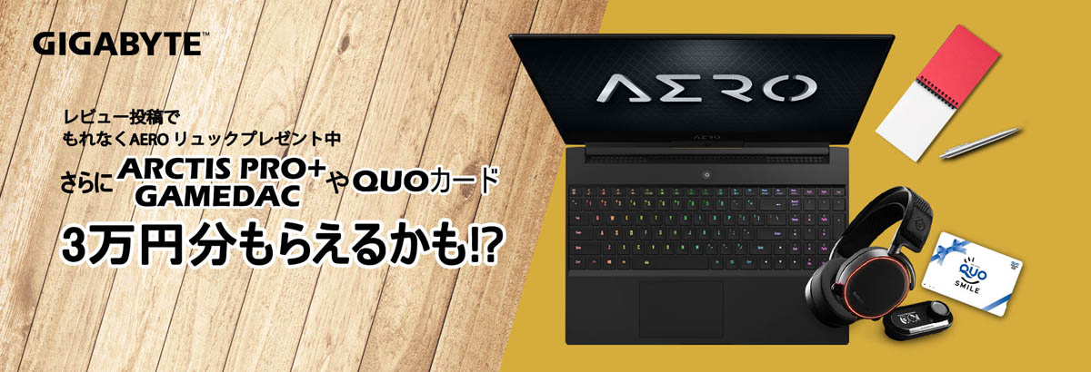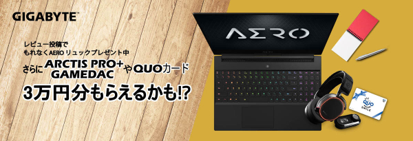 2020年4月15日~6月14日の期間中、第9世代および第10世代のIntel Coreプロセッサを搭載したノートPC(AEROシリーズおよびAORUSシリーズ)を購入し、Amazon.co.jpやZigsow、価格.comなどに100文字以上のレビューを投稿した方に、もれなくGIGABYTEオリジナルAEROバックパックを差し上げるキャンペーンを実施いたします。また、応募者の中から金賞レビュー1名様と銀賞レビュー5名様を選出し、金賞受賞者にはQUOカード3万円、銀賞受賞者にはSteelSeries ARCTIS PRO+ GAMEDACゲーミングヘッドセットを贈呈いたします。応募締切は2020年6月30日。応募方法等の詳細につきましてはキャンペーンページをご参照ください。