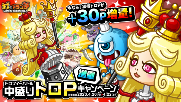 株式会社アソビズム(本社:東京都千代田区、代表取締役:大手智之)は、App Store・Google Playにて好評配信中の『城とドラゴン』で、「トロフィーバトル 中盛りトロP増量キャンペーン」を2020年4月20日(月)より開催いたします。