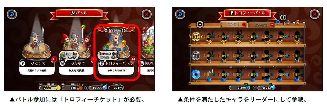 トロフィーバトルは、出場条件を満たしたキャラをリーダーにして戦い、“トロP”を獲得することが目的のバトルです。