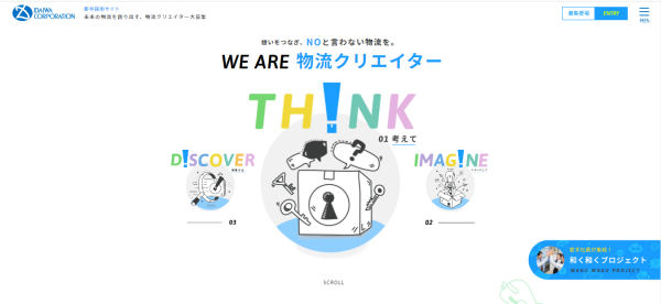 これまで採用活動においてアピールしてきた「社員の人柄の良さ」「アットホームな社風」「充実した福利厚生」だけでなく、物流業界や倉庫業の仕事そのものに興味関心を持ち、一歩先のモノの流れを考えられる“物流クリエイター”となりうる学生と出会いたいという想いを込めました。トップページには、物流クリエイターとして求める3要素(考える・イメージする・発見する)をイラストで表現しています。社長メッセージや福利厚生の紹介、社員インタビューはもちろん、”物流クリエイター“という考え方や物流用語説明など、社員の写真を多く用いさまざまな角度からダイワコーポレーションを知っていただけるコンテンツを企画しています。