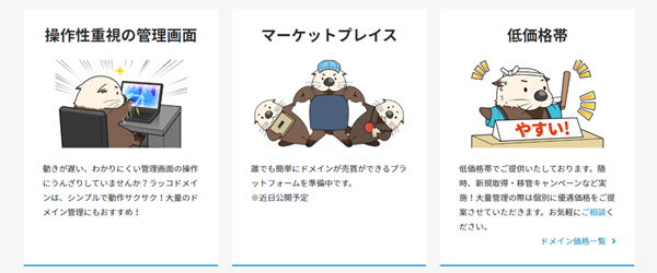 動きが遅い、わかりにくい管理画面の操作にうんざりしていませんか?ラッコドメインは、シンプルで動作サクサク!大量のドメイン管理にもおすすめ!