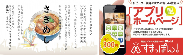 自治体の管轄地域の「さきめし」導入店を紹介するポータルサイトと「さきめしすまっぽん!」を作成します。それにより、飲食店への前払いサービス「さきめし」で飲食店を経済面で応援でき、「すまっぽん!」でテクアウト・お店情報などを閲覧者に届けることで、さらなる店舗への応援を行います。