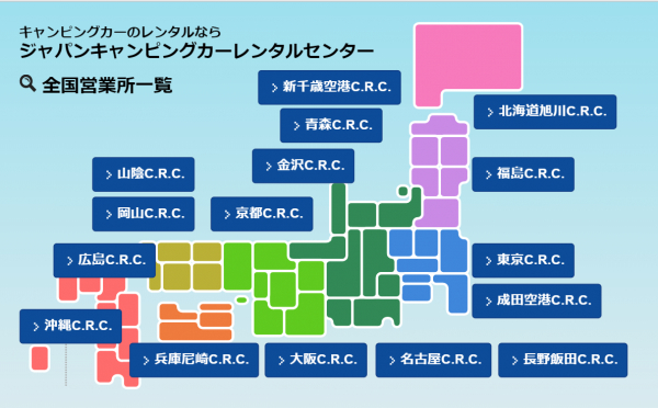 「Japan C.R.C.」は、東京キャンピングカーレンタルセンターをはじめ、新千歳C.R.C.、旭川C.R.C.、青森C.R.C.、福島郡山C.R.C.、成田C.R.C.、金沢C.R.C.、長野飯田C.R.C.、名古屋セントレア空港C.R.C.、大阪C.R.C.、兵庫尼崎C.R.C.、京都C.R.C.、岡山C.R.C.、広島C.R.C.、山陰鳥取C.R.C.、沖縄C.R.C.をグループ傘下に収める日本最大級のキャンピングカーレンタルサービスです。はじめての方でも手軽にキャンピングカーの魅力を体験でき、行き先、用途、ご利用人数に合わせ、お好みの車種をお選びいただけます。