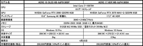 一方、「AERO 17 HDR WB-8JP4130SH」は、Adobe RGB 100%をカバーする17.3型4K HDRパネルを採用し、CPUには8コア/16スレッドのIntel Core i7-10875Hを搭載、NVIDIA GeForce RTX 2070 Max-Q 8GBを組み合わせたモデルです。メモリにはDDR4-2933 16GB、ストレージに512GBのM.2 PCI-e SSDを備えています。