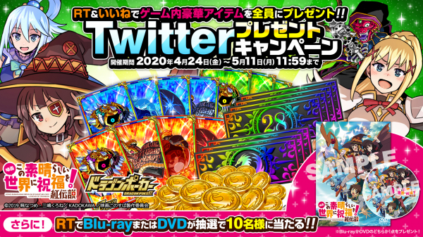 株式会社アソビズム(本社:東京都千代田区、代表取締役:大手智之)は、App Store・Google Playにて好評配信中の『ドラゴンポーカー』と爆裂大ヒットアニメ!『映画 この素晴らしい世界に祝福を!紅伝説』のコラボを記念して「Twitterプレゼントキャンペーン」を、2020年4月24日(金)より実施することをお知らせいたします。
