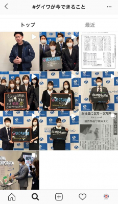 当社では新型コロナウイルス感染拡大を受けて、2月末から2021年卒採用の会社説明会を中断しています。現在は毎朝の検温や手洗い、マスク着用を徹底し、3密の防止に努めるなど従業員の健康面を考慮しながら業務を行っています。感染予防に気を付ける日々の中で、「Instagramを閲覧している学生や保護者に向けて新型コロナウイルス感染予防に関する当社の取り組みや社員の想いを伝えたい」との声が若手社員から上がり、オリジナルのハッシュタグ『#ダイワが今できること』をつけた投稿を4月より本格始動しました。