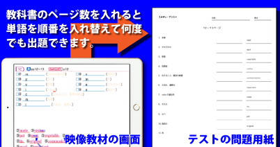 たとえば、英単語であれば、教科書のページ数を指定すると、何通りもの出題形式で確認テストが可能です。新出英単語を発音する機能もついているので、単語が読めないといったことがありません。