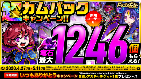 4月27日(月)より久しぶりにログインするユーザーや新規ユーザーを対象に、竜石が最大1246個もらえる「超カムバックキャンペーン」を開催いたします。