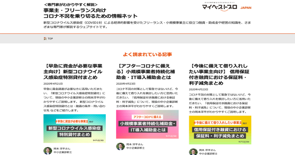 お金に関するノウハウだけではなく、コロナ詐欺対策やメンタル・フィジカルケア情報なども発信。フリーランスや小規模事業主がコロナ不況を心身ともに健やかに乗り越えるために役立つ情報を網羅する予定です。