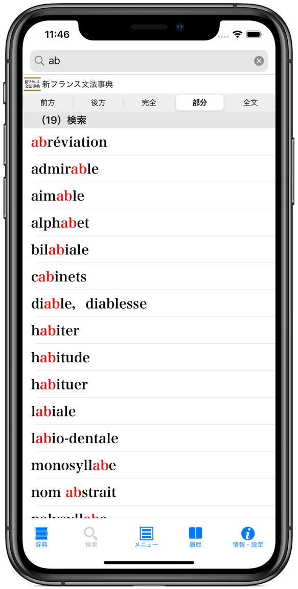 それぞれの検索方法で、文字を入力すると候補見出し語が表示されるインクリメンタルサーチに対応(部分一致/全文検索を除く)