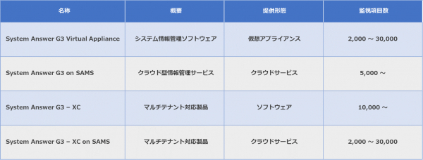 「System Answer G3 Virtual Appliance」は、システム情報管理ソフトウェア「System Answer G3」の仮想アプライアンス版です。必要となる OS や各種ミドルウェアが構築済みであるため、導入に係る工数やコストを大幅に軽減し、システム監視をすぐに開始することができます。また、「System Answer G3 on SAMS」は、「System Answer G3」のクラウドサービス版です。資産を保有することなく、規模やサービスの拡大に柔軟に対応したシステム監視を実現することが可能です。