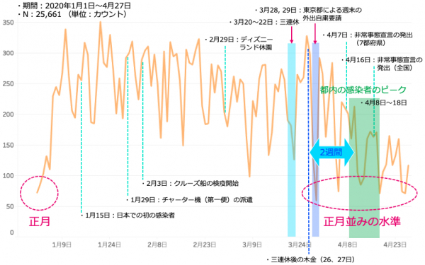 4月7日に、7都府県に向けて非常事態宣言が発出されました。発出後からは流動人口が顕著な減少傾向を見せ、特に週末においては”正月並み”の減少が認められました。また、都内の感染者のピークの約2週間前は三連休後の木、金に当たり、三連休だけではなく、平日の”気の緩み”も感染者数の増加に寄与していたのかも知れません。