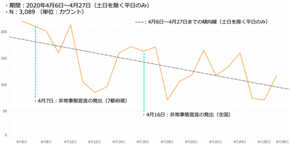 4月6日から27日までの平日のみの日本人の流動人口の傾向を見てみると、顕著な減少傾向が認められます。