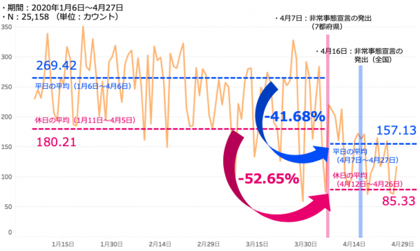 また、4月7日の7都府県への非常事態宣言の発出の前後の流動人口の推移に注目してみると、平日の1日の平均は約41.68%減、休日では約52.65%減となっており、全体として顕著に減少していることが分かります。