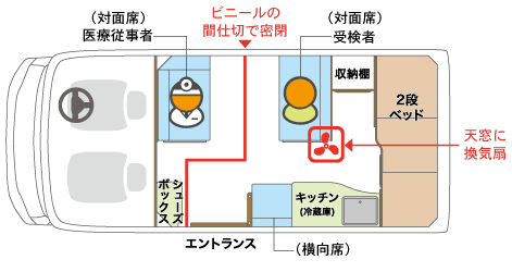 出入りの際、医療従事者は運転席側のドアを、受検者は反対側車内側面のエントランスを使用していただくことで、接触を避けていただきます。