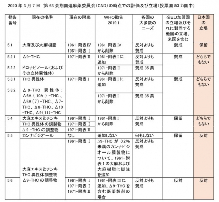 2020年3月2~6日にオーストリア・ウィーンで行われた第63会期国連麻薬委員会(CND)において、大麻及び大麻関連物質のWHO勧告に対する投票を延期しましたが、事前準備の段階で、各国がWHO勧告に対しての意見および賛成、反対、保留、どちらでもないという立場を表明しています。
