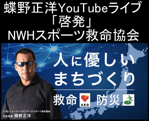 一般社団法人ニューワールドアワーズスポーツ救命協会代表理事でプロレスラーの蝶野正洋さんが登壇する、5月10日(日)、日本消防会館・ニッショーホールにおける『蝶野正洋35周年フォーラム~新型コロナウイルス感染予防啓発~』が、YouTube【蝶野チャンネル】でライブ配信されます(無観客)。