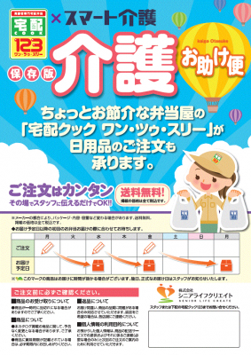 プラス株式会社(東京都港区 代表取締役会長兼社長 今泉嘉久)は、介護福祉施設向けデリバリーサービス「スマート介護」(https://www.smartkaigo.jp/)事業で、高齢者専門宅配弁当サービスを展開する株式会社シニアライフクリエイト(東京都港区 代表取締役社長 高橋洋)と連携し、宅配弁当サービス「宅配クック123(ワン・ツゥ・スリー)」を利用する全国のお客様を対象に※、日用品等の注文配達「介護お助け便」を2020年5月18日 より順次開始します。