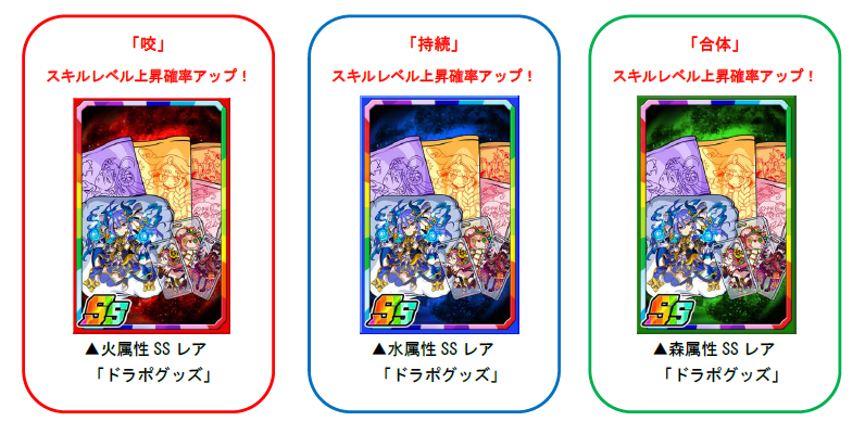 限定強化素材「ドラポグッズ」は一部のモンスターに使うと強化値2倍の効果があるほか、咬・持続・合体のスキルレベル上昇確率もアップします。