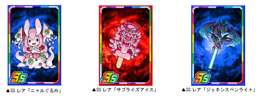 ダンジョンのボスモンスターを倒すと、まれに限定子分カード「ニャルぐるみ」「ジェネシスペンライト」「サプライズアイス」が手に入ります。