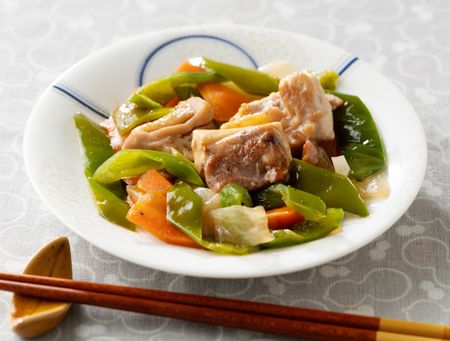 京野菜の万願寺唐辛子と相性の良い国産の鶏肉と玉ねぎをピリ辛に炒めてあります。