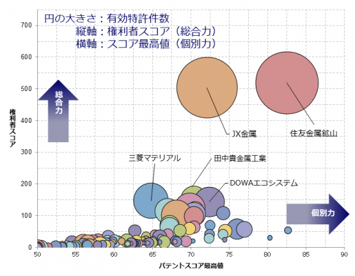 総合力1位の住友金属鉱山は「廃リチウムイオン電池からの有価金属の回収方法」や「白金族元素の分離回収方法」などが注目度の高い特許として挙げられます。