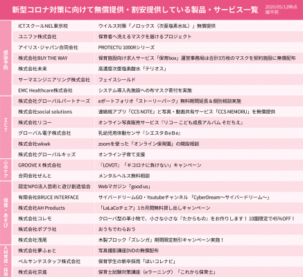 また、民間企業の間では、子どもたちや保護者のために奮闘している園と保育者を支援するため、マスクや除菌クリーナー、動画共有サービスなどを無償で提供する動きが広まっています。そこで、サンロフトが11,000施設に毎月配布している『パステル IT 新聞』のスポンサーネットワークを活かし、園を支援する企業情報を集約しました。