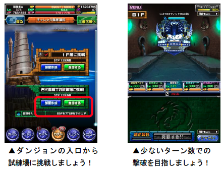 「古代魔導士の試練場」は、全6階層のダンジョンです。全ての階層にボスが出現し、ミッションクリアや宝箱などから、倒したボスのカードを稀に入手することができます。また、倒すのにかかった合計ターン数が表示され、それに応じた称号をもらうことができます。