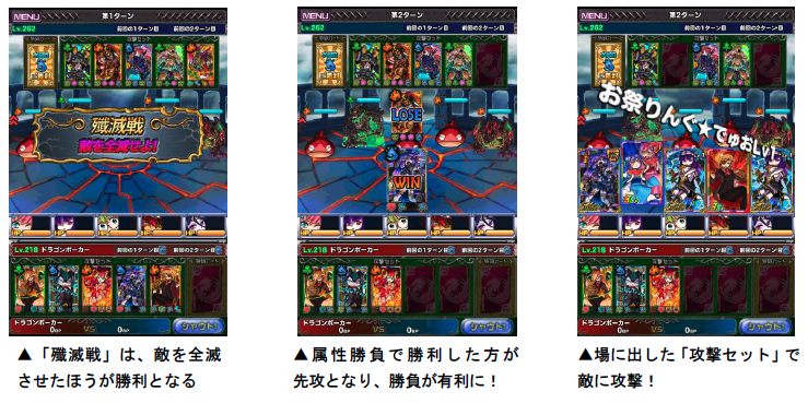 バトルは、基本的に3ターンで決着をつけます。「殲滅戦」と「防衛戦」に関しては、3ターンで決着がつかなかった場合(全て引き分け、またはBPが同じだった場合)、勝利条件を満たすまでバトルを行なうサドンデスモードに入ります。