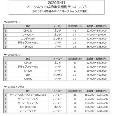 情報流通支援サービスの株式会社オークネット(本社:東京都港区/社長:藤崎清孝)は、2020年4月度のオークネットバイクオークションにおける成約台数を集計し、排気量別ランキングベスト5をまとめました。