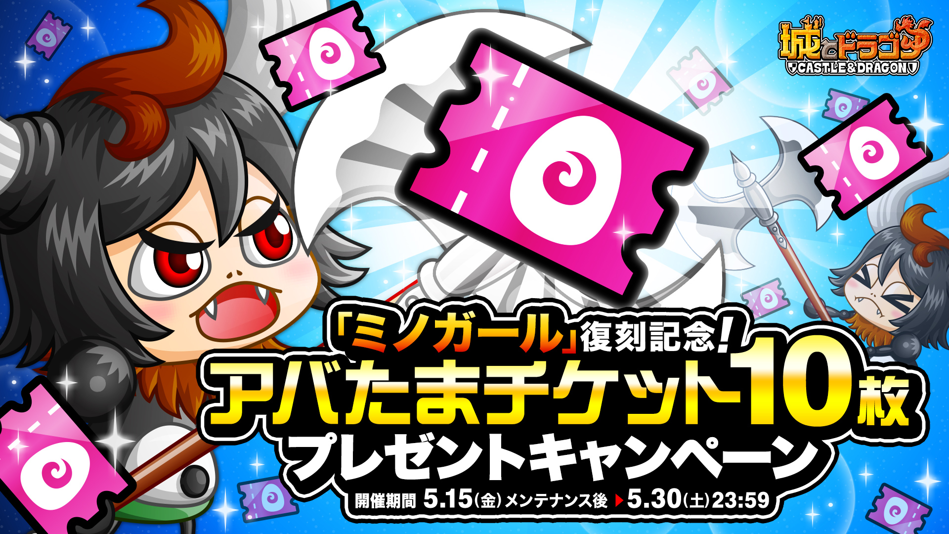 「ミノガール」復刻を記念して、下記期間中に『城とドラゴン』にログインすると、「モモモのアバたまチケット」が10枚プレゼントされます。