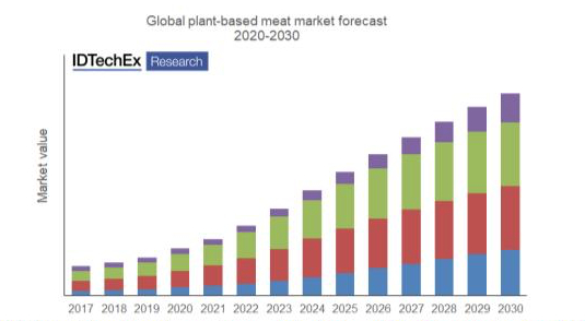 IDTechExは、この業界に関する技術、市場見通しをまとめた、調査レポート「植物由来肉および培養肉 2020-2030年」を発行しています。