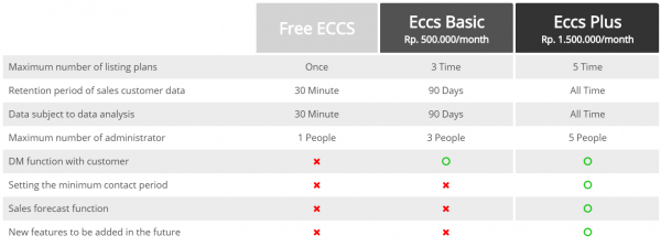 「ECCS」の利用対象はインドネシアに進出する日系企業および現地企業ですが、コロナ影響下でとくに苦境にあえぐ中小事業者支援のため、無料プラン(下図のFree ECCS)・簡易プラン(下図のECCS Basic)を追加しました。