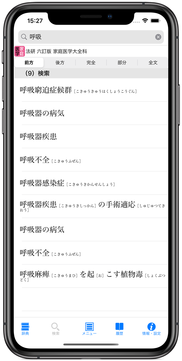 それぞれの検索方法で、文字を入力すると候補見出し語が表示されるインクリメンタルサーチに対応(部分一致/全文検索を除く)