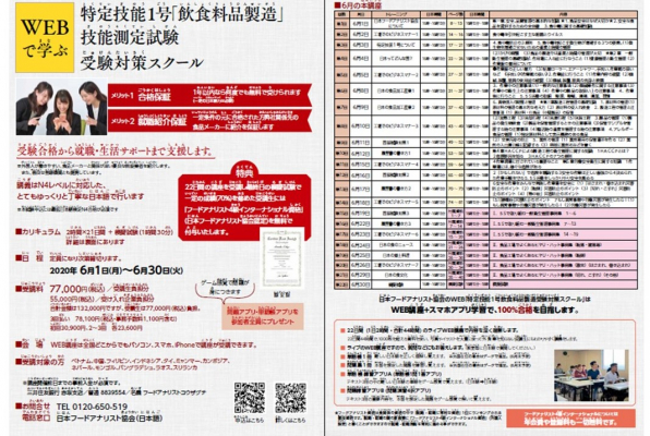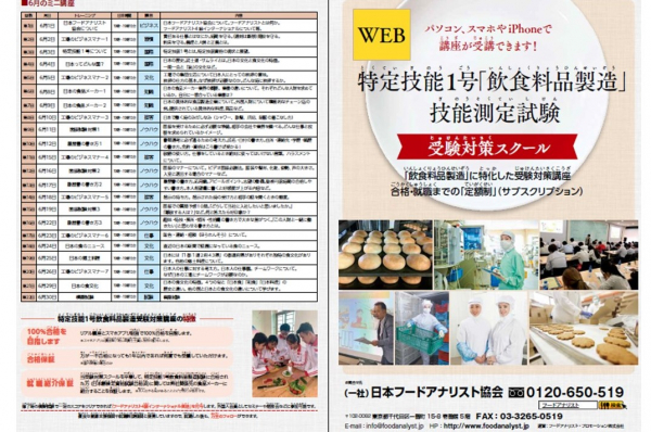 受験対策問題集は、日本フードアナリスト協会が実施する特定技能1号技能測定試験試験対策スクール(飲食料品製造)終了日6月30日(火)に受講生全員に配布予定。