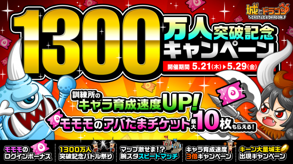 株式会社アソビズム(本社:東京都千代田区、代表取締役:大手智之)は、App Store・Google Playにて好評配信中の『城とドラゴン』で、「1300万人突破記念キャンペーン」を2020年5月21日(木)より開催いたします。