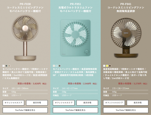 お家の中や外出時、いろいろなシーンで活躍してくれるハンディファン、リビングの扇風機の機能をそのままに小さくなった充電式の全く新しいミニリビングファン、人感センサー付きのタワーファン、リビングファン、サーキュレータなど商品ラインナップをご紹介。サイズや機能別、価格・カラーバリエーションで比較できるまとめページです。